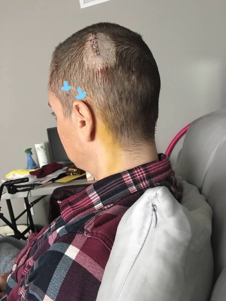 A bruise marks the path made to thread the wires from the IPG to the connectors. You can also see some scabs from where the halo was bolted.